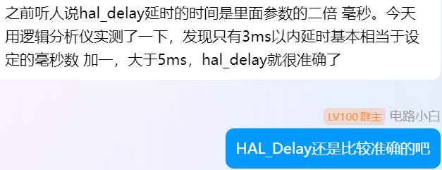 今晚群友利用逻辑分析仪测试HAL_Delay的实际延时时间。这里感谢群友:MDLZCOOL 的测试数据