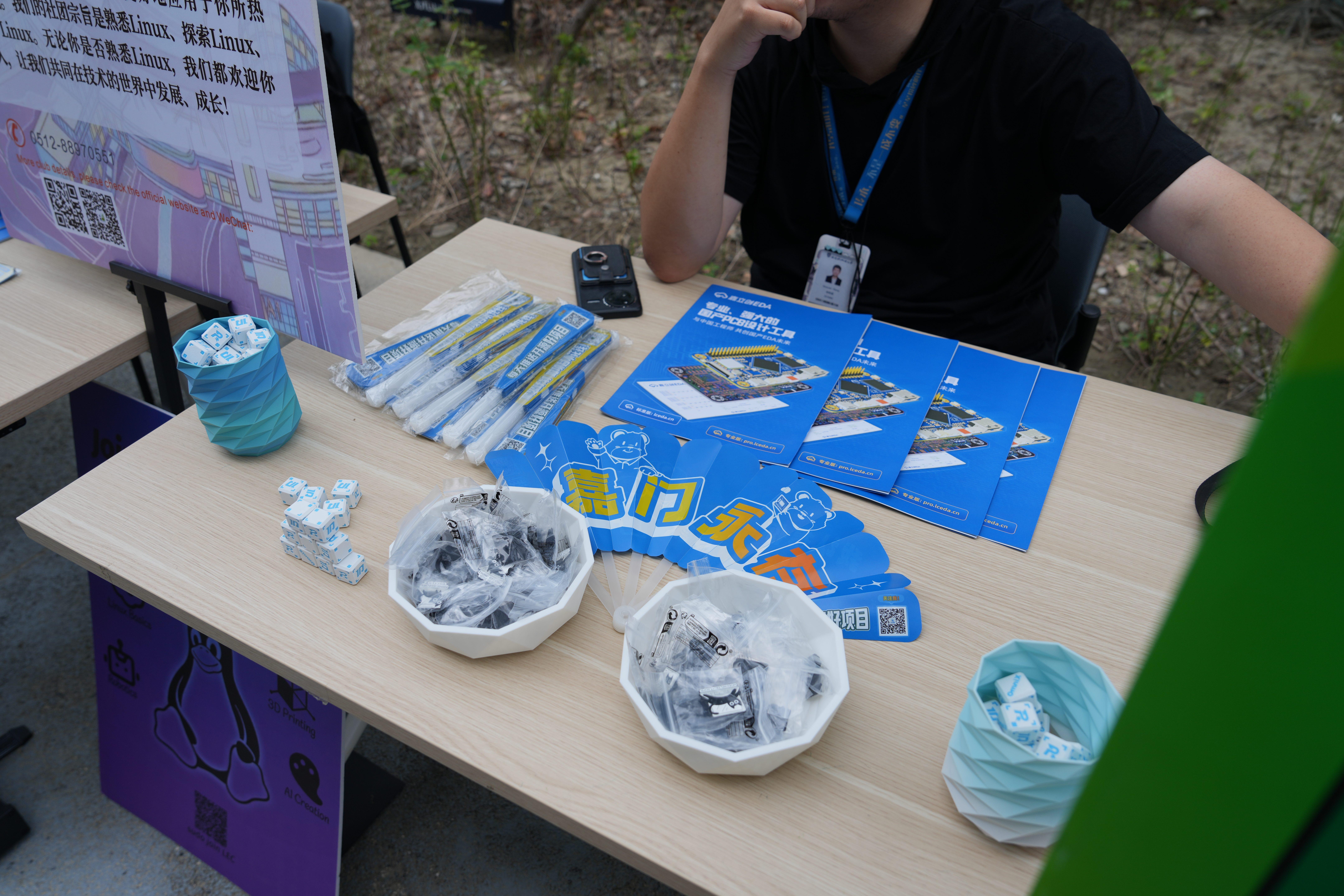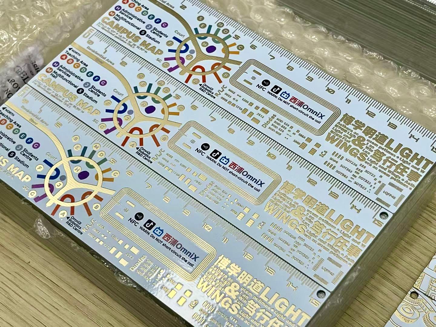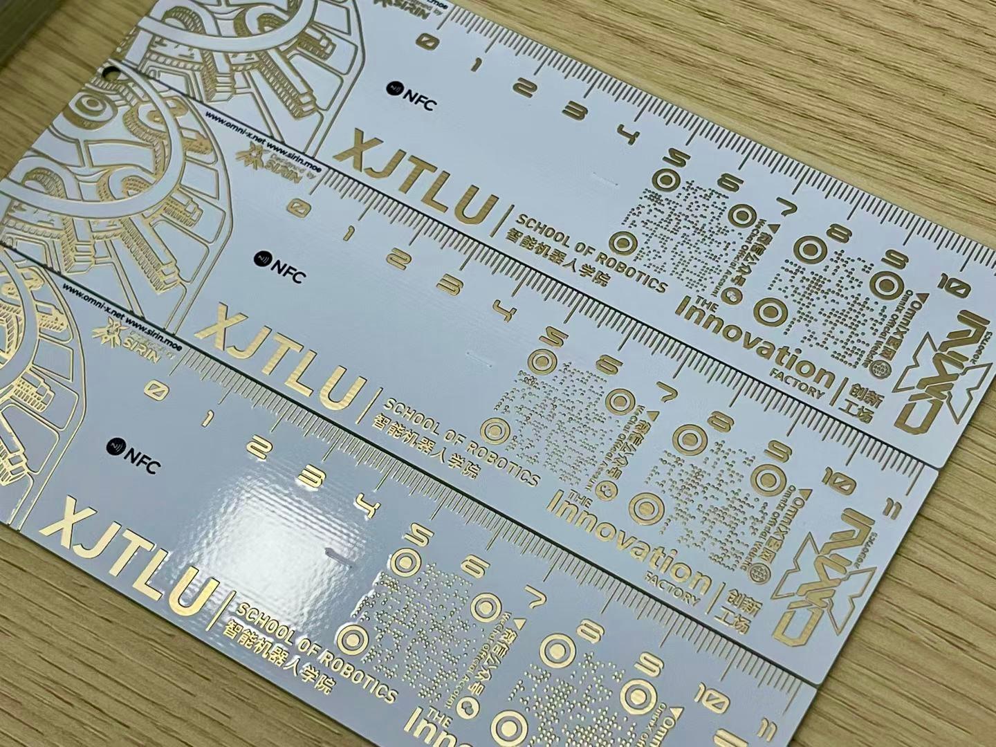 通过嘉立创设计的具有NFC功能的彩色沉金PCB尺子,一亮相便成为了全场焦点。彩色沉金工艺赋予尺子细腻的质感和亮眼的外观,独特的PCB材质更是彰显了嘉立创在电子制造领域的专业底蕴。不少同学在看到尺子的瞬间便被其吸引,纷纷驻足询问“这是用PCB板做的吗?”“这上面的芯片有什么作用呀”,好奇与喜爱之情溢于言表。