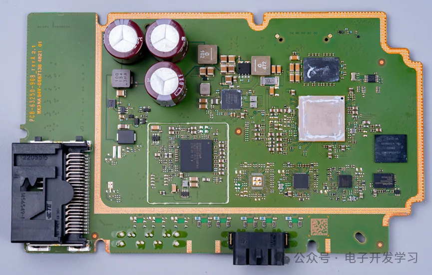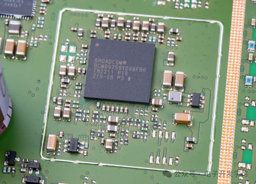 这颗来自博通的BCM89259是一颗汽车以太网交换机芯片。外围有一整圈开窗上锡,有可能是预留焊接屏蔽壳。