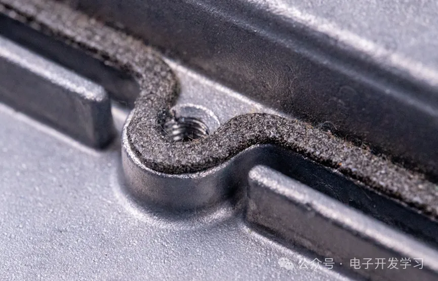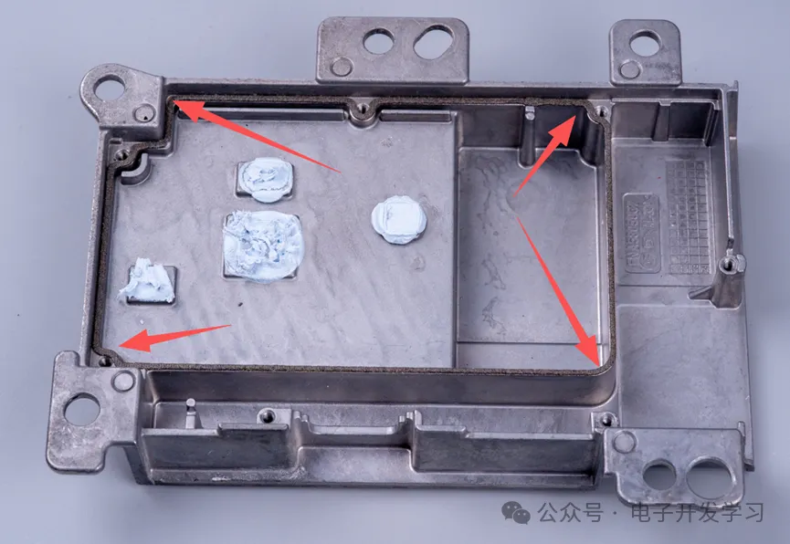 这样当板子安装进去之后,这一圈露铜就被紧紧压在外壳上这一圈导电海绵上,从而形成良好的电磁屏蔽和接地。外壳上有四个散热凸台,凸台上涂了散热硅脂,当PCB安装上去之后,散热硅脂填充于散热凸台和发热量较大的IC之间,把IC热量快速传导到外壳实现散热。