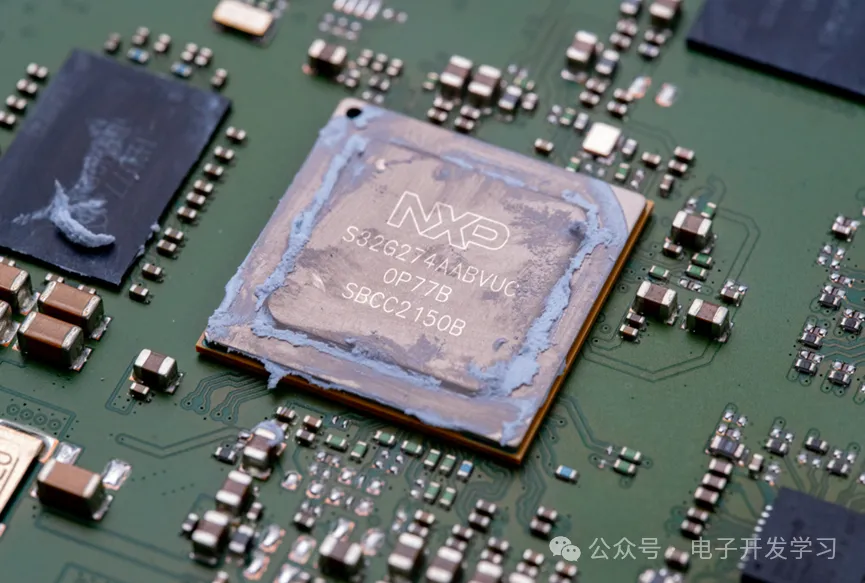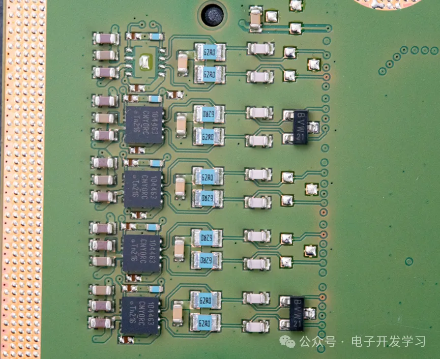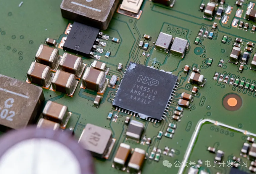处理器用的是NXP的S32G274,这是一颗车规级网络处理器芯片。S32G274一般运行AUTOSAR或者Linux,不知道它是通过什么方式来实现网关协议转环的。芯片周围有一些绿色和蓝色的电阻,看着不便宜的样子。从芯片引出的少许信号走线大多数是差分对引出,然后打孔走到内层了。