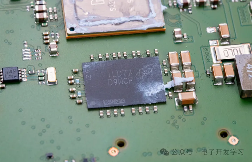 镁光的DDR颗粒。处理器到DDR走线都是在内层完成的,顶层基本上铜皮覆盖。而且内层肯定是有很多地平面用来隔离信号层,由此看来这个板子的层数会很高,我估计在10层往上。这种叠层结构很奢侈,但是不得不说,这种在PCB层面就已经把EMC的问题降到了最低,完整的铜皮包覆,既能避免EMI辐射,又能避免敏感信号受到电磁骚扰,可以说是铜墙铁壁了。再加上板子正反面露铜加外壳包裹,这可能是我见到过的EMI处理最好的电子产品模块。