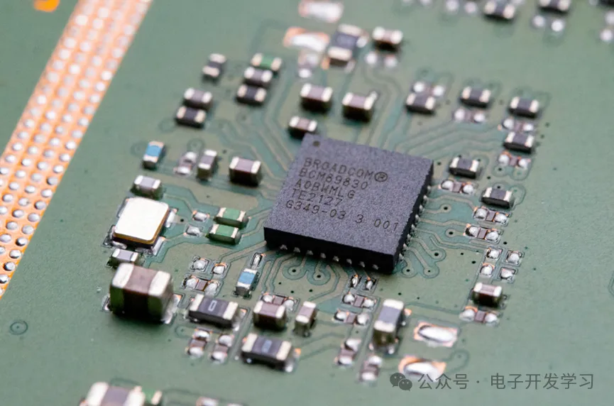 这颗来自博通的BCM89830,其功能是低功耗车载以太网物理层收发器,也就是我们常说的PHY。这个芯片是QFN封装,所以信号都从周围引出,部分直接通过via进入内层,其余连接到外围阻容,这个小的电路单元之外也全是铜皮包裹。