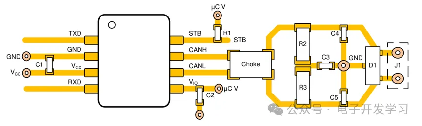 板子上的布局布线和TCAN1044A-Q1数据手册里的参考Layout指南不能说一模一样,只能说毫无二致。