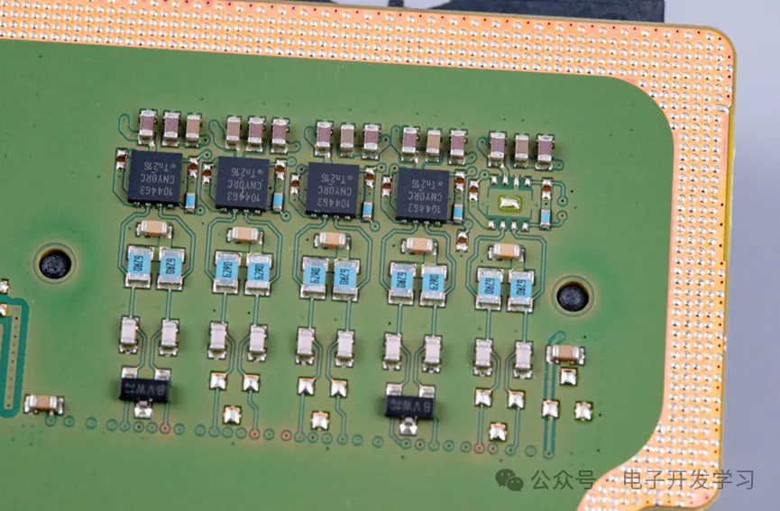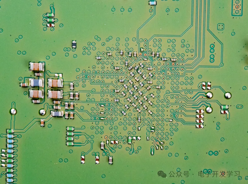 板子上的关键电路看完了,再欣赏一些设计细节。这是处理器背面的Layout细节,芯片底部放置一些0201小电容,把大的电容电感放在外围。