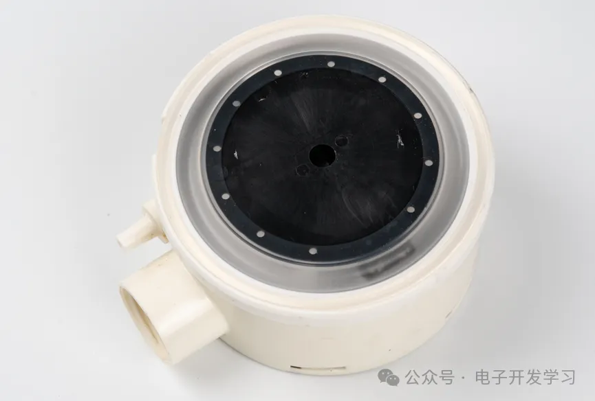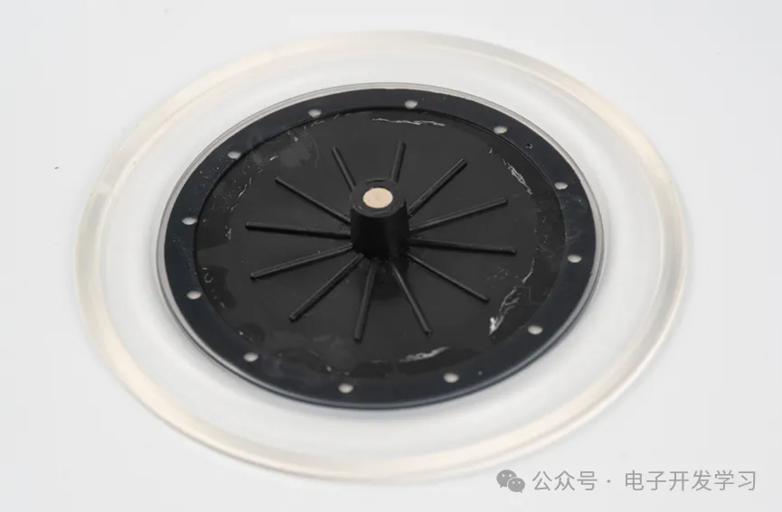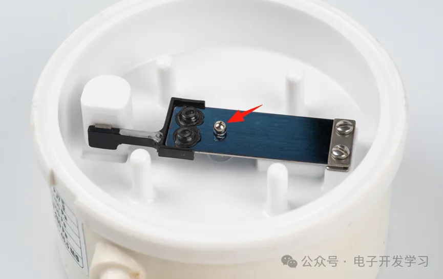这样的话,大概就可以推测出这个变送器的检测原理:橡胶软垫两侧存在差压之后,会压到金属片上的小球,从而导致金属片弯曲,金属片弯曲之后,带动右端的塑料件上的磁铁位置改变,从而被霍尔传感器检测。通过这样的一个流程,就可以把差压转换为霍尔传感器的输出,再经过一些处理最终可以用来表征差压值。