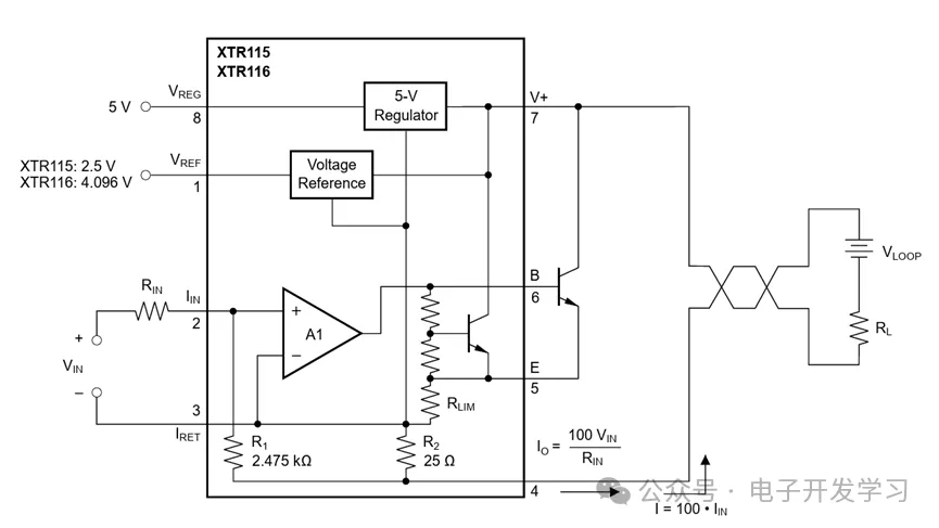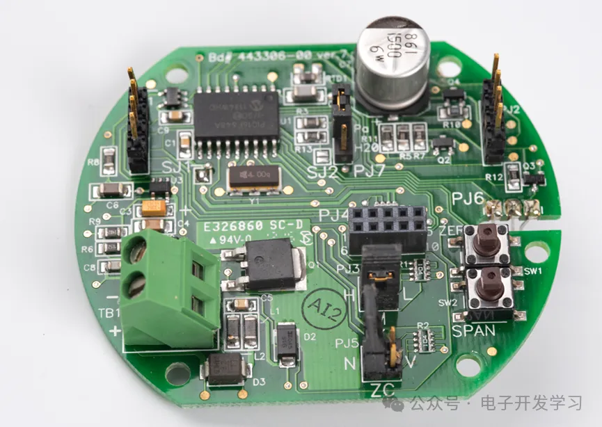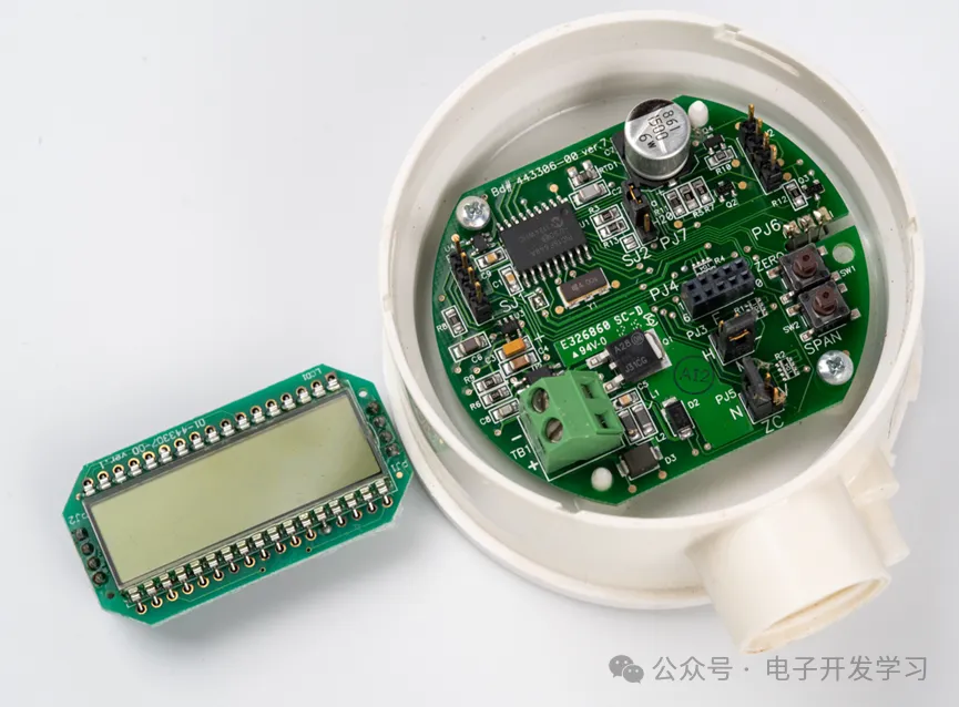 变送器输出端子。XTR115UA/2K5是来自Ti的4-20mA电流环路变送器芯片,所以这个变送器是电流输出型。