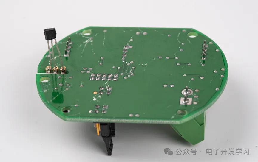 从这个角度可以看到线性霍尔器件的安装方式:PCB边缘开槽,然后槽边放置通孔焊盘,把霍尔传感器焊接在上面。