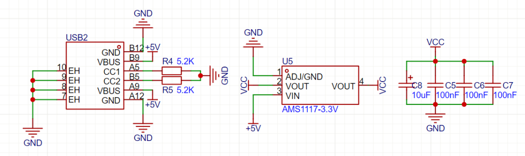 电源使用6Pin-TypeC提供,利用AMS1117-3.3V进行降压稳压,由于核心板本身所需要的电流极低,因此AMS1117-3.3V的输出电流足够核心板使用。