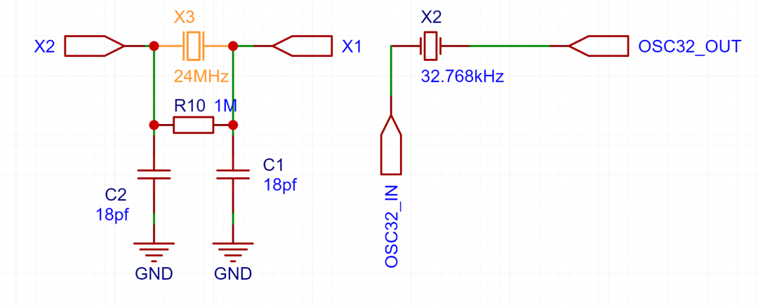 高速晶振由两个18pF电容接地,并联一个1M电阻(这里的电容、电阻实际参数需要根据选用的晶振频率来调整)。