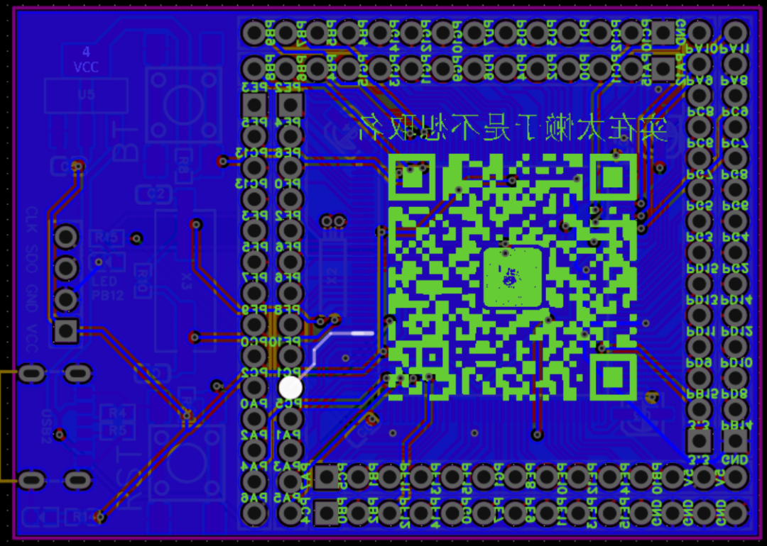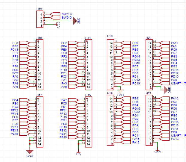 我们引出所有的IO(其中SWCLK和SWDIO作为下载口并且留有一个引脚作为板载LED使用)。下载口最少需要使用2线Debug即SWCLK和SWDIO给Jlink或者STlink下载使用。