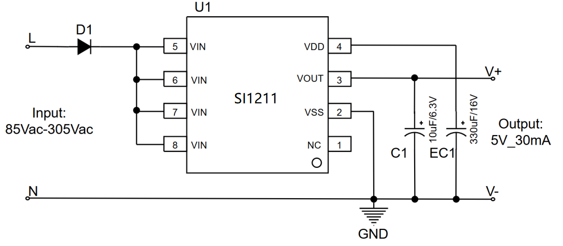 SI1211纯线性方案在输出5V/30mA以内的应用上,达到极致性价比和最小尺寸。