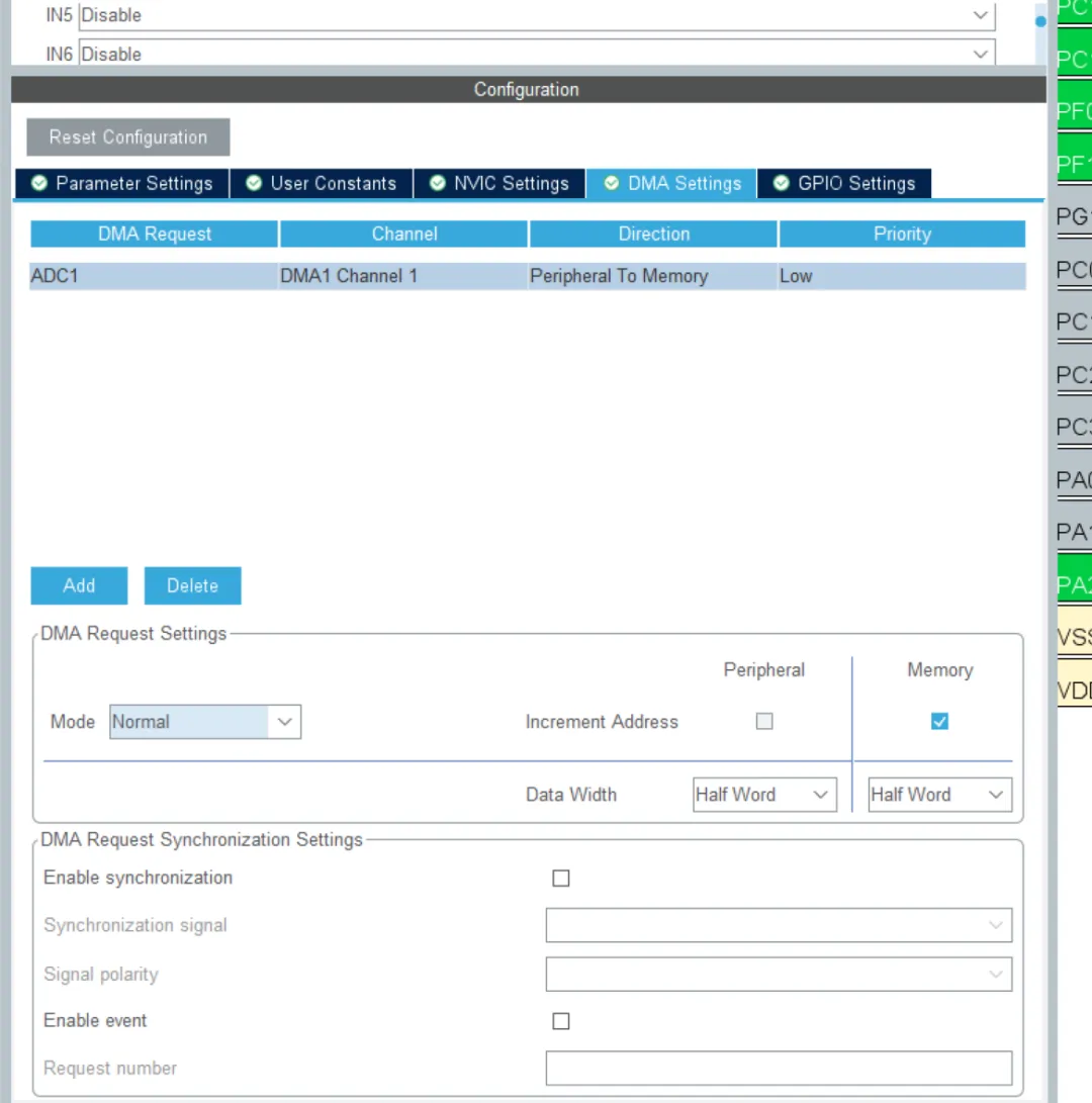 在ADC中选择一个通道开启,并且打开ADC对应的DMA,DMA选择默认模式即可。由于ADC的位数是12位ADC,因此DMA的位宽选择为Half Word即16位。