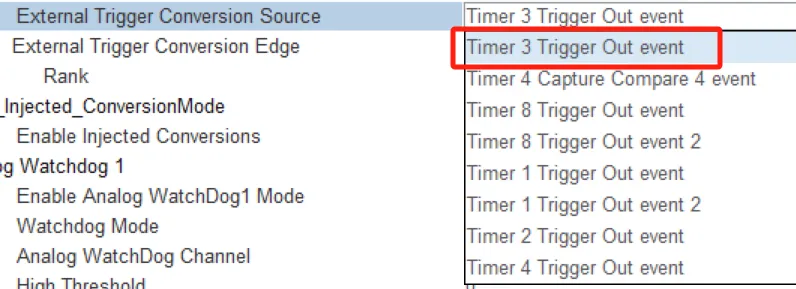 将ADC的触发模式更改为Timer3的事件触发。之后进行定时器的配置。