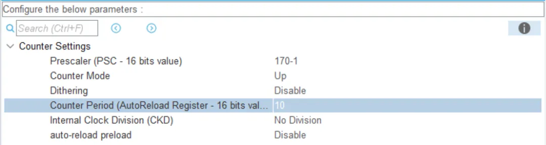 例如我们的主频是170MHZ,设置分频系数是170-1,计数值为10,这样子我们的定时器触发频率就是100KHZ.