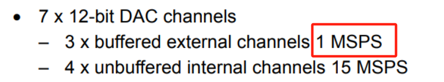 从参考手册上可以看到外部DAC的采样速率为100万样本每秒。这个参数决定了DAC最大的输出速率。后面经过测试,大概DAC可以输出200KHZ的正弦波,不过分辨率设置的不是特别高,16个点每周期。