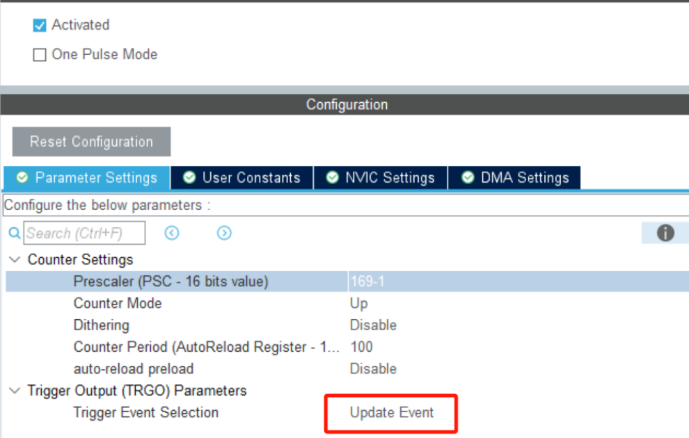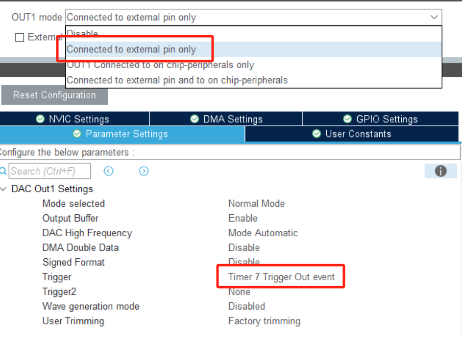 配置DAC连接到外部引脚(其他型号的没这么复杂,因为G4的DAC可以连接到内部的运放)并且触发方式选择定时器事件触发。