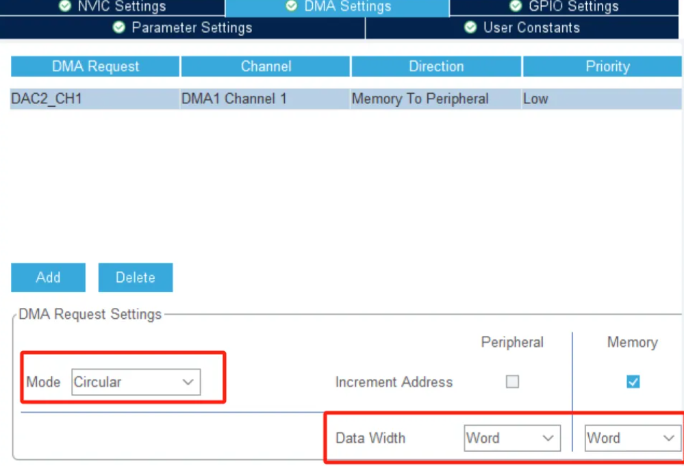 添加DMA通道,选择合适的数据宽度。将DMA模式选择为循环模式。这样子就可以连续输出我们设置的信号了。需要注意的是,这里要选择32位宽的,选择16位宽会传输有问题。