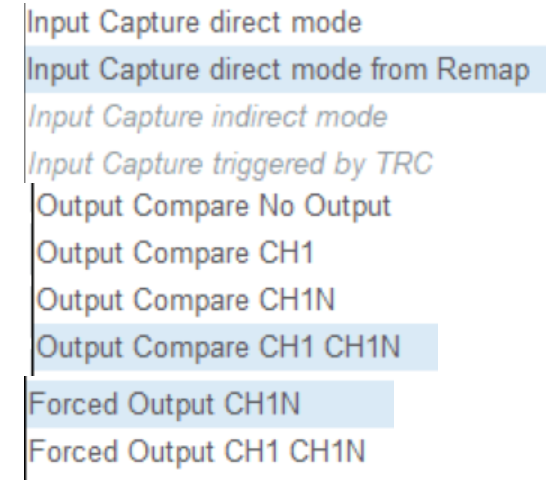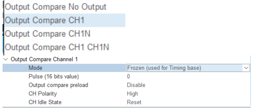 可以看到比较输出的模式比较多,但是仔细分析其功能。他是一个功能非常强大功能。Frozen是冻结引脚输出,引脚不输出高低电平。但是当计数值到达比较值时会触发比较输出的中断回调函数。