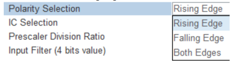 当我们配置一个通道为输入捕获时,会有四个设置,主要需要关心的是:Polarity Selection捕获模式,Rising Edge即信号上升沿(0->1)触发捕获。