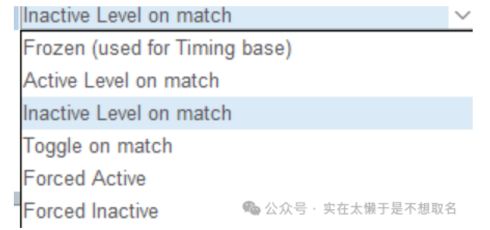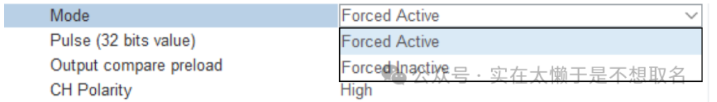 Active Level on match是到达比较值时将引脚设置为高电平(不会主动拉低)。Inactive 则是拉低。