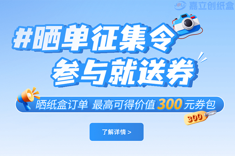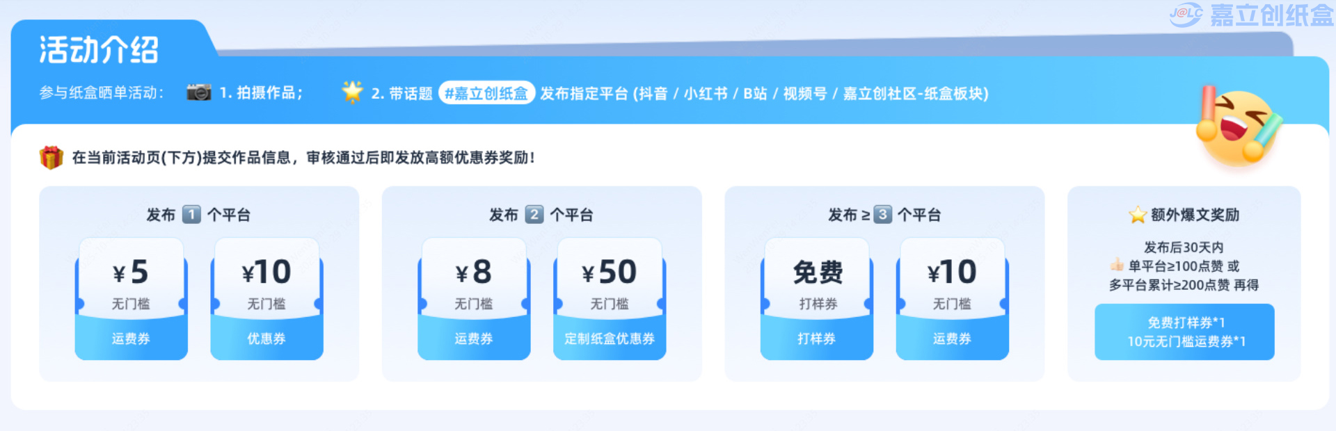 那个承载您创意设计的嘉立创纸盒,也值得一个闪亮的舞台!无需复杂操作,只需晒出您的专属包装,就能冲击价值300元的大额券包!优质内容更有机会拿下2张纸盒免费打样券~