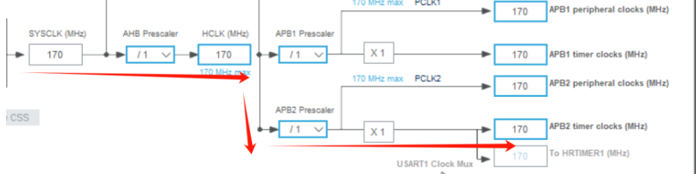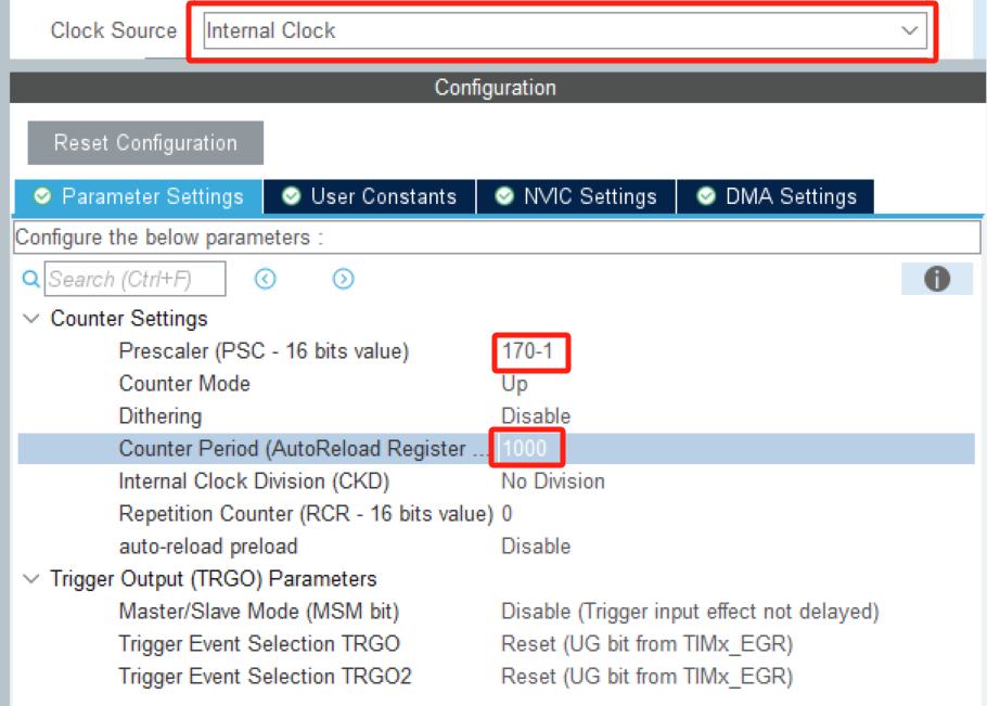 打开CubeMX,配置定时器分频系数为170-1,周期计数值为1000,主频为170MHZ。由此我们可以计算一次溢出的为: