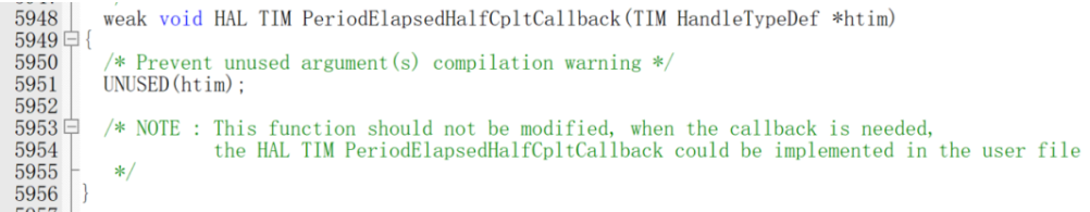 我们可以看到,中断回调函数在底层被一个虚函数定义,这段注释告诉用户,不要修改这个函数的默认实现。如果需要自定义的回调行为,应该在用户的代码中重新实现这个回调函数。