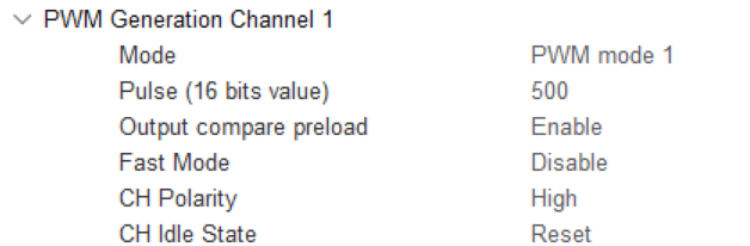 上面我们设置了定时器的单周期参数为1000,接着我们设置PWM的比较值(Output compare preload)为500,那么占空比就是:500/1000 = 50%。