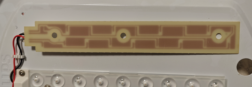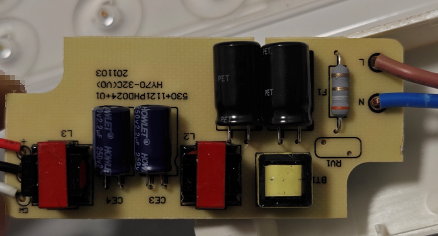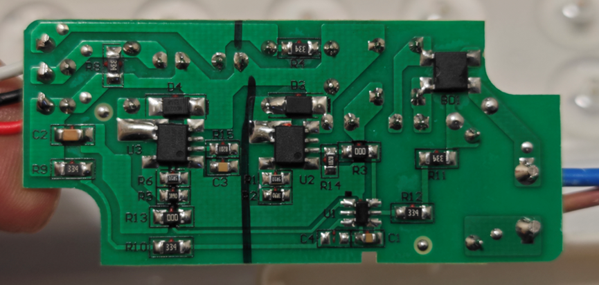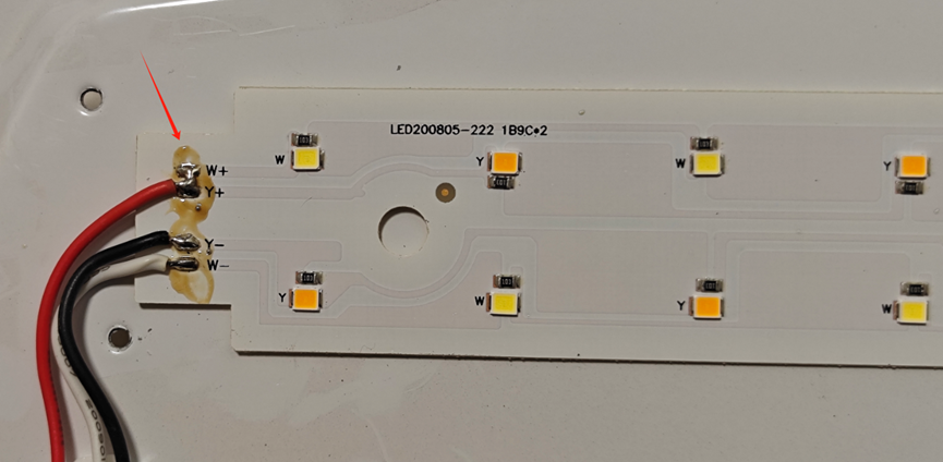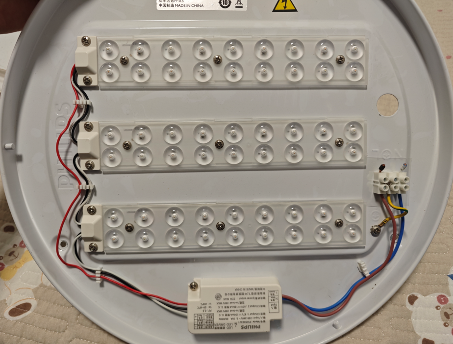 要把灯板拆下来,需要先把顶头的这个塑料盖板拆下来。拆下来之后可以看到线是怎么焊接的。可以发现这三个灯板是串联的,但是由于每个灯板上有两种不同色温的灯,所以是三个板子上相同色温的灯串联。这两串灯是共阳极的,驱动端控制的是阴极,这个从之前的电路图里也可以看出来。