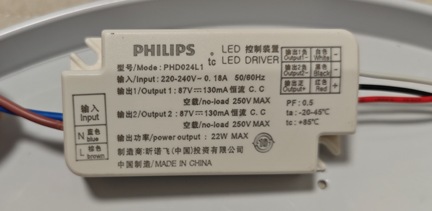 LED控制器品牌是PHILIPS,型号是PHD024L1,最大输出功率22W。三根输出线,分别是