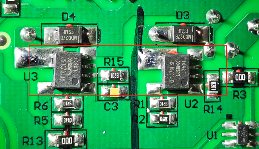 这两个SOP-7封装的芯片,丝印KP1070LSP,型号是KP107XL。该芯片的功能是:非隔离、降压型准谐振LED功率开关。主要的应用场景就是大功率LED照明。下面是简单的原理图。