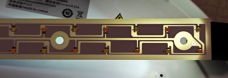 这是第三个板子,打开之后可以看到。确实是阳极连接在一起的。板子上的两种颜色的灯是交错排布的,这样只亮一种色温的时候,看起来会比较均匀。
