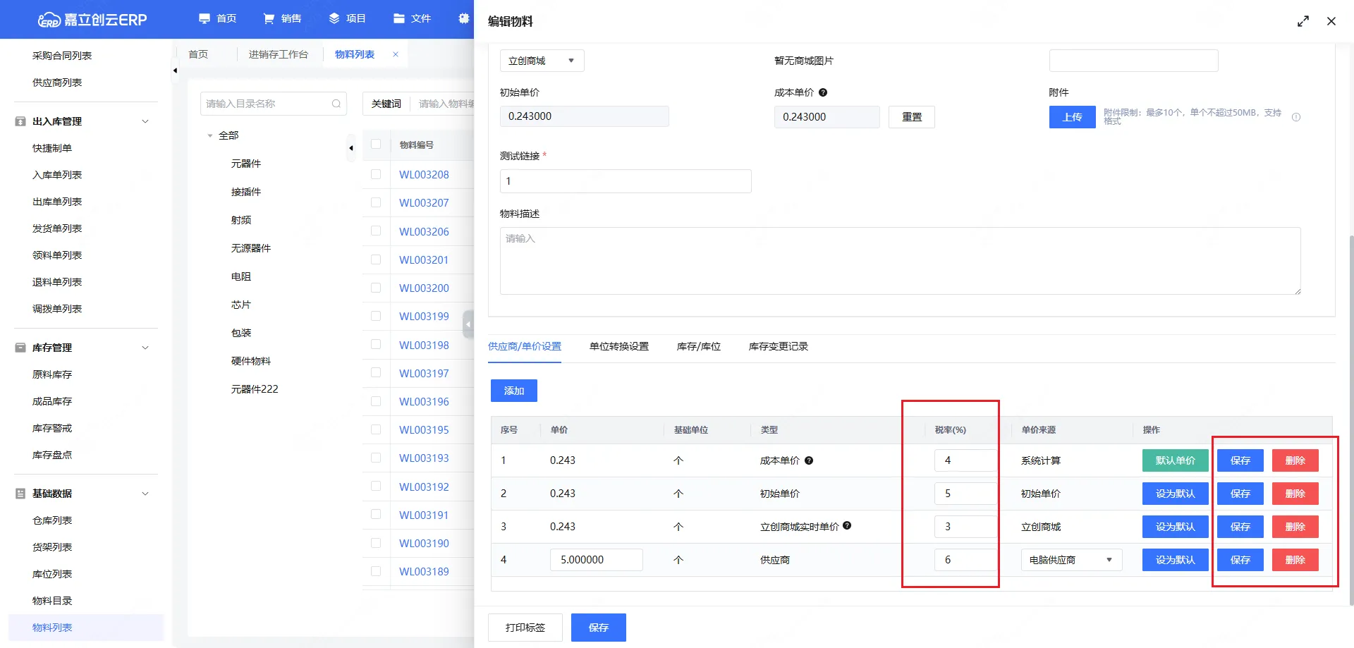 2,物料列表,新增/编辑支持设置增加税率、税金