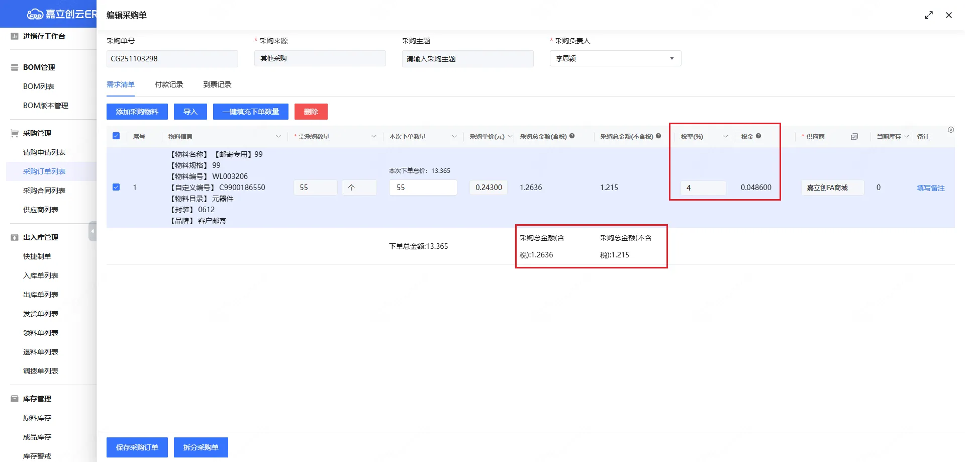 3,采购单,新增/编辑增加税率、税金显示