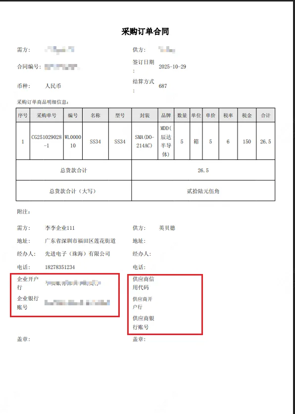 3,采购合同模板支持配置选择(供应商:信用代码,开户行,银行账号),(企业:新增开户行、账号)