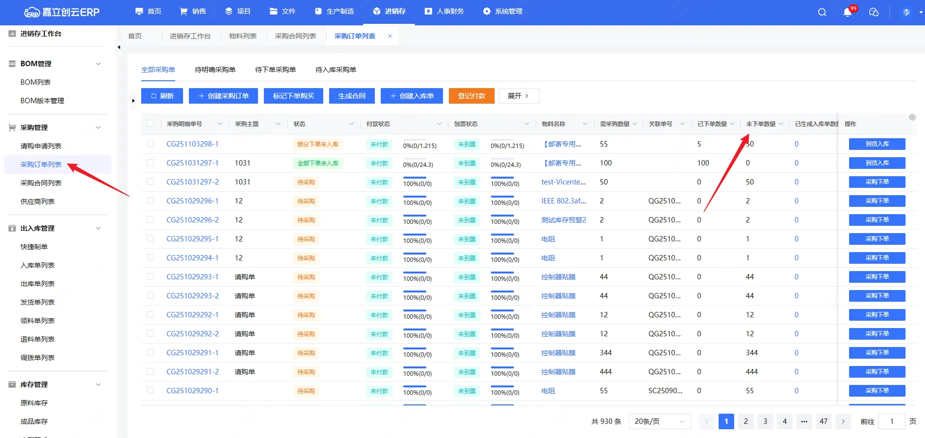 四、采购订单列表增加未下单数量字段显示