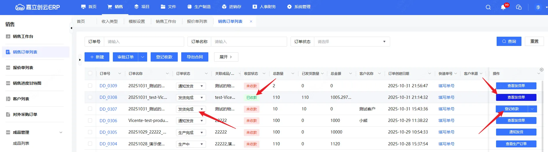 2,销售订单已收款,操作按钮变更“查看发货单”