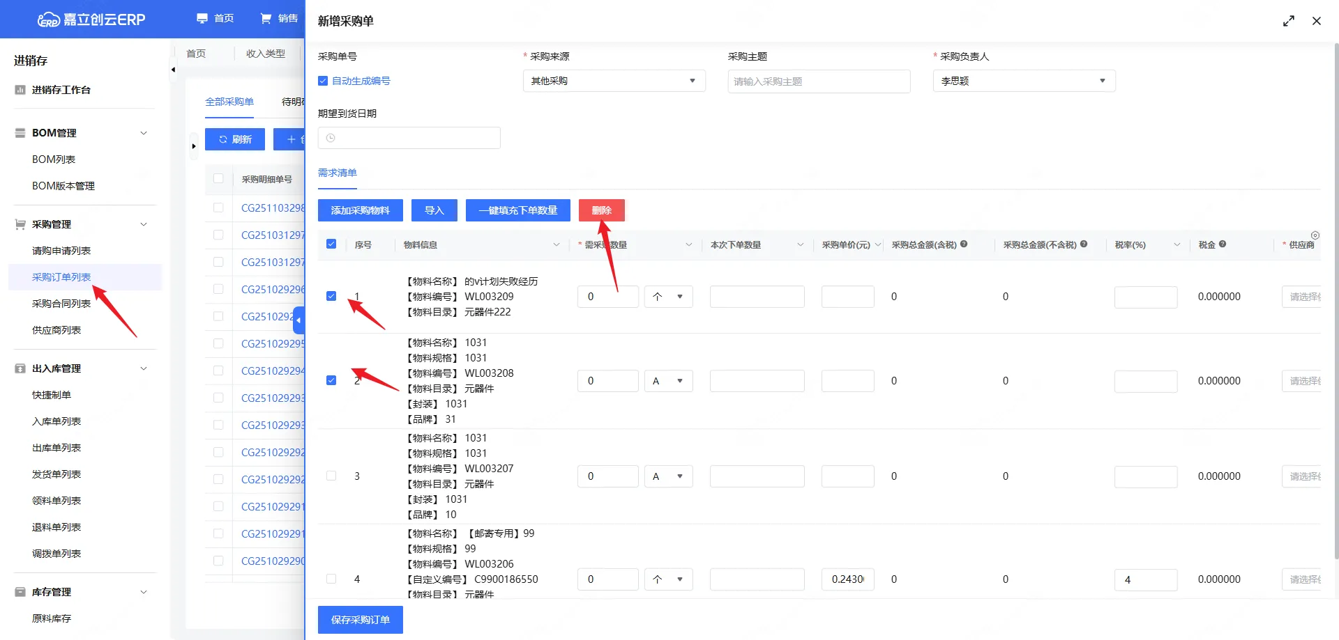 5,采购单列表,新增采购单页面增加一个批量删除功能