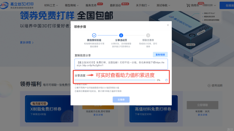 4、采用自助领券模式,登录免费打样活动页面并分享活动链接,完成助力任务后即可领取至账户;