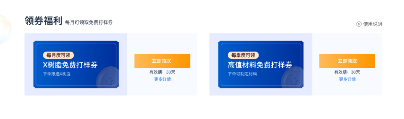 (1)在当月领券页面,会存在两张可领取的免费打样券:①X树脂免费打样券,②高值材料免费打样券。选择其中一张后,当月将无法领取另一张,只能等下个月再次领取。一经领取,无法更换。
