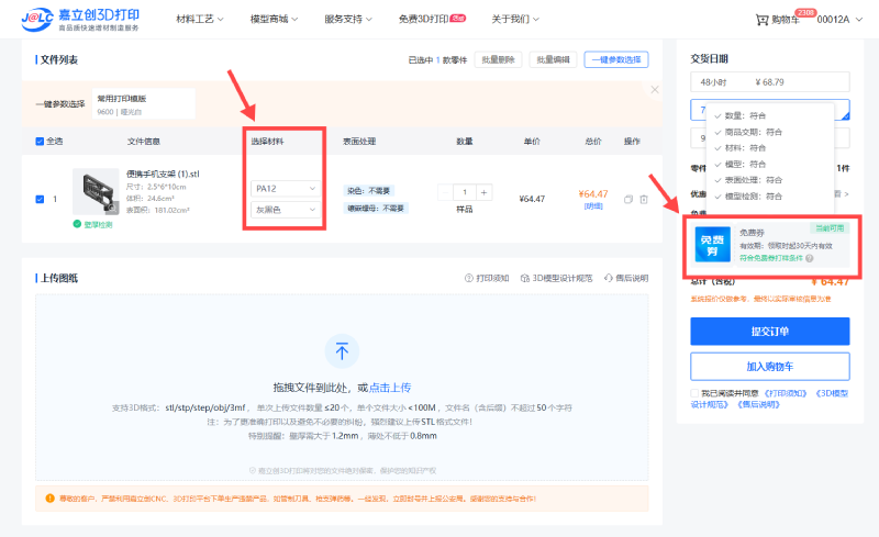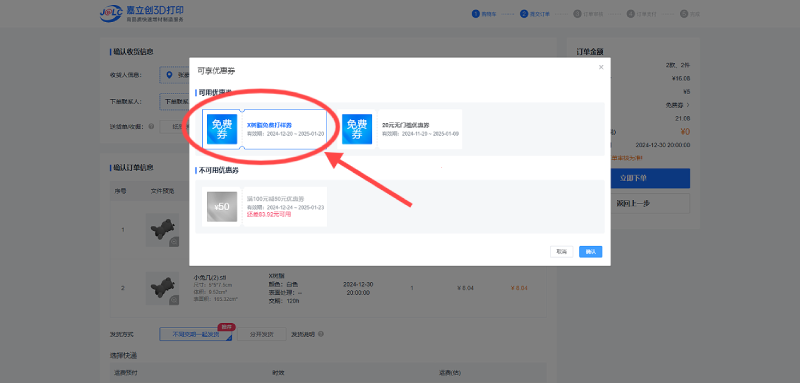领券后,在3D打印下单环节,客户可根据实际情况选择是否使用免费打样券。 如需使用,请点击“优惠券”,然后选择当前订单想使用的优惠券即可。