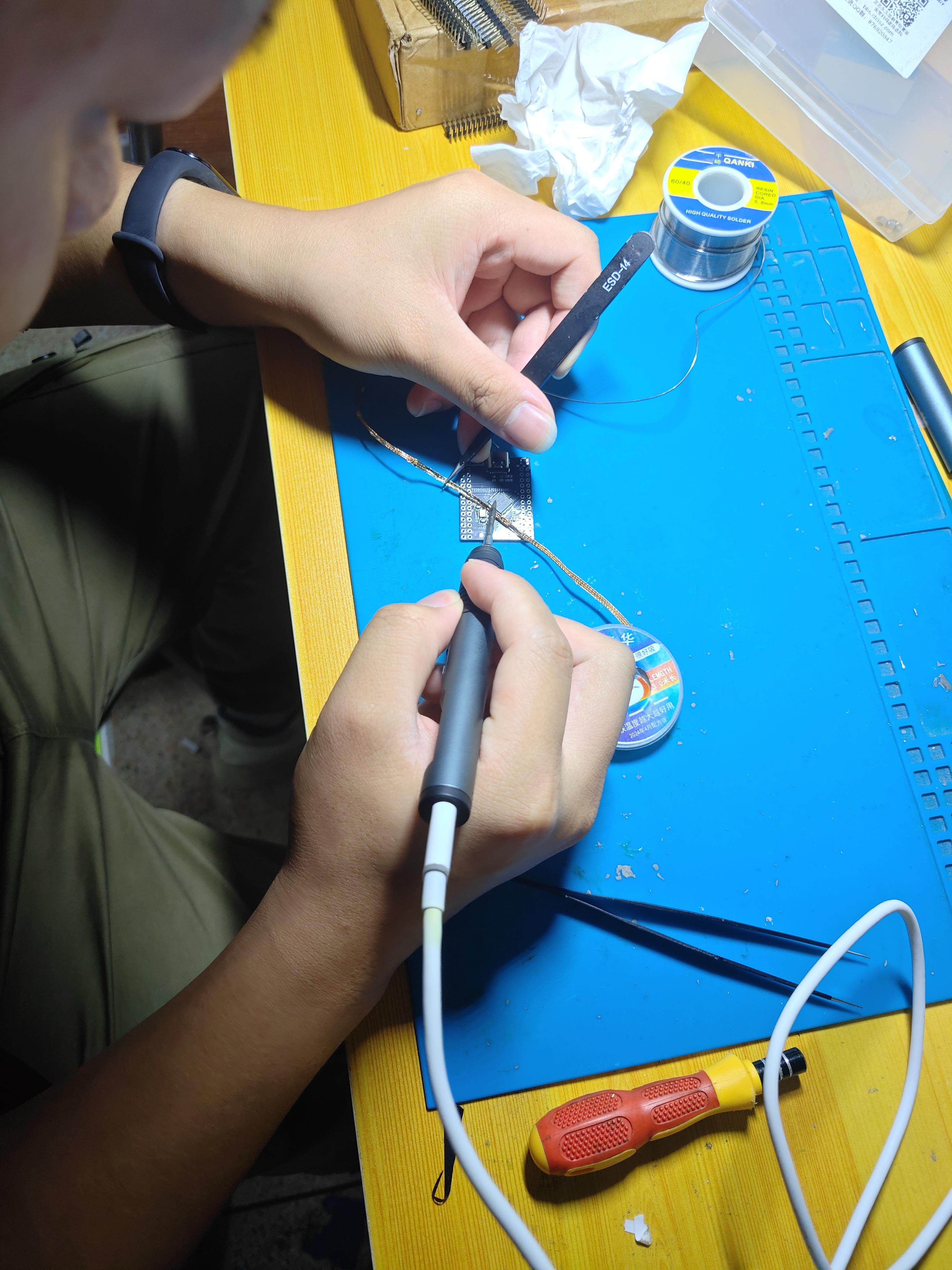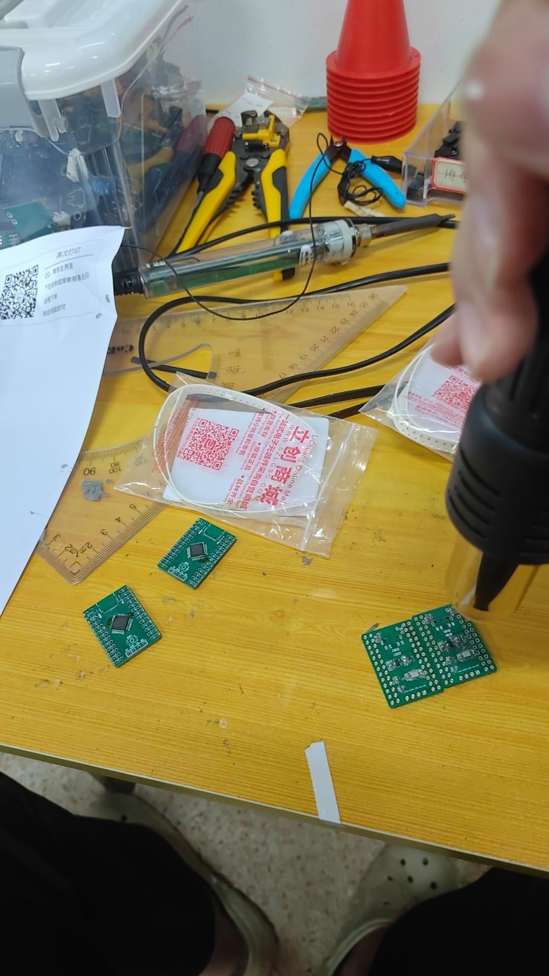 实践操作阶段,成员们以小组为单位展开协作,焊接环节更是将培训氛围推向高潮。成员们提前整理好电烙铁、焊锡丝、助焊剂等工具,认真清洁PCB板焊盘。焊接时,大家屏息凝神,左手持焊锡丝,右手握电烙铁,精准控制烙铁温度和焊接时间,先为焊盘上锡,再将电阻、电容等小型元器件一一对应焊接,对于引脚密集的AI8051U芯片,更是小心翼翼调整角度,确保每个引脚都焊接牢固且不短路。过程中,小组内成员分工明确,有的负责焊接,有的负责元器件筛选,有的负责焊接质量检查,遇到虚焊、连锡等问题时,大家围在一起分析原因,借鉴彼此经验尝试解决,比如用吸锡带清理多余焊锡,用细砂纸打磨氧化的引脚。