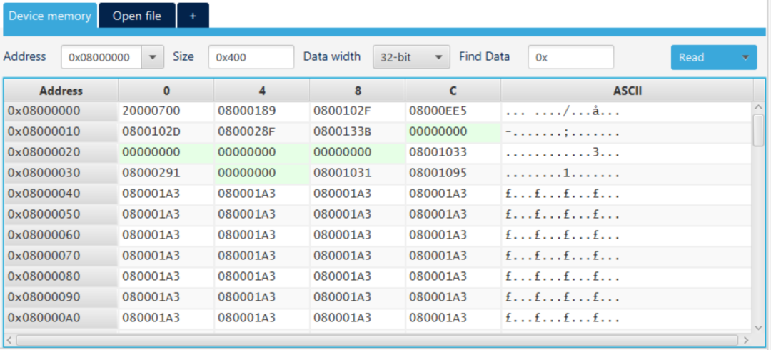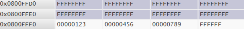 0x08000000开始,可以看到我的程序写到了0x8008CF0就结束了,后面都是未写的空间。