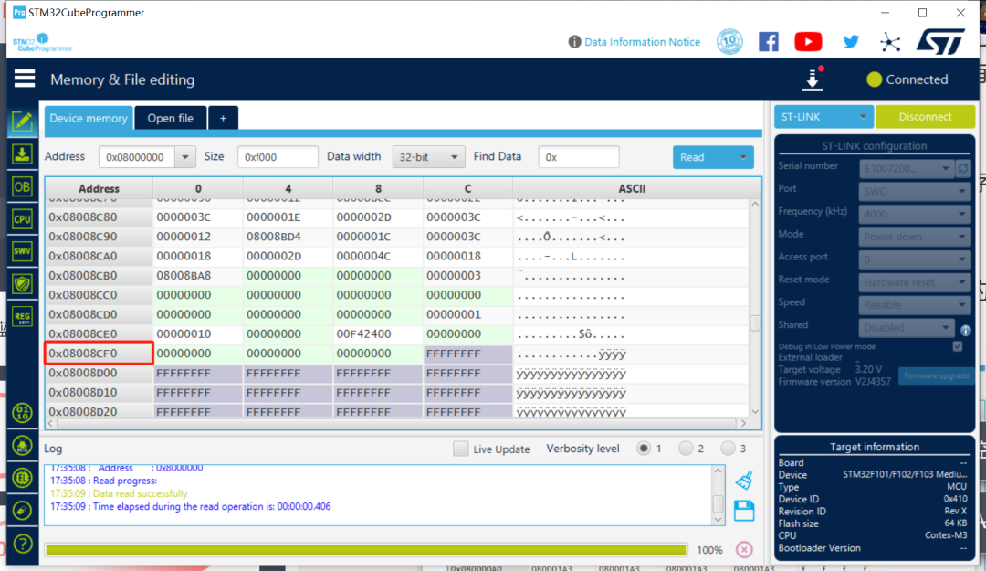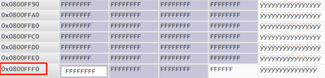 可以看到成功的读取了Flash地址800FFF0的值。这里用了volatile关键字,目的是防止目标地址的值被优化(不加也不会出什么大问题)。