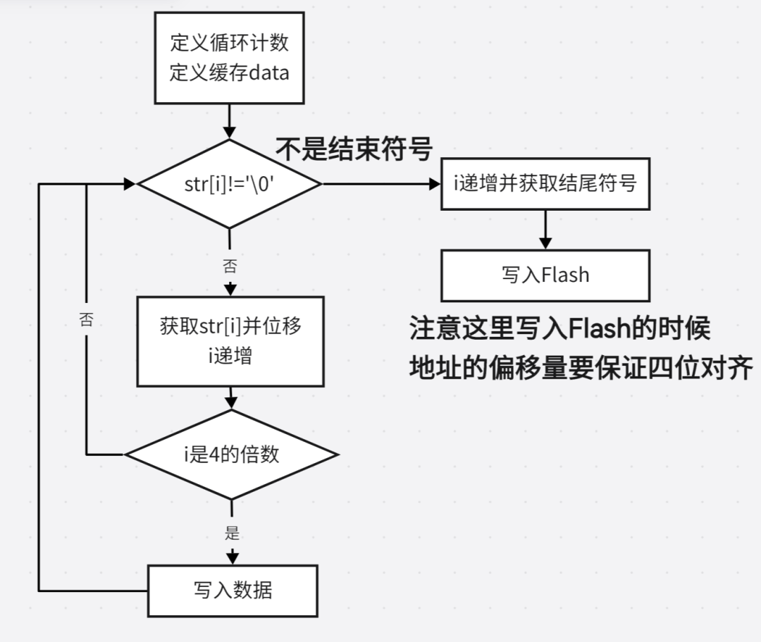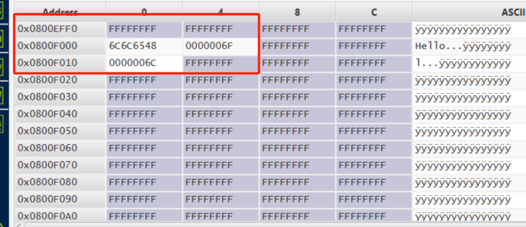 内存空间和值是不变的,不同类型表达的输出方式不同。这也就是为什么我们要多走一步,把字符串结束符号\0也写入Flash的目的,这样子才会让uint8_t*截到完整的字符串。