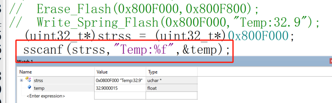之所以采用字符串,是因为我们可以用sprintf函数和sscanf函数来快速获取我们需要的值。例如这里我们写入Temp:32.9来假设我们保存了一个温度数据。