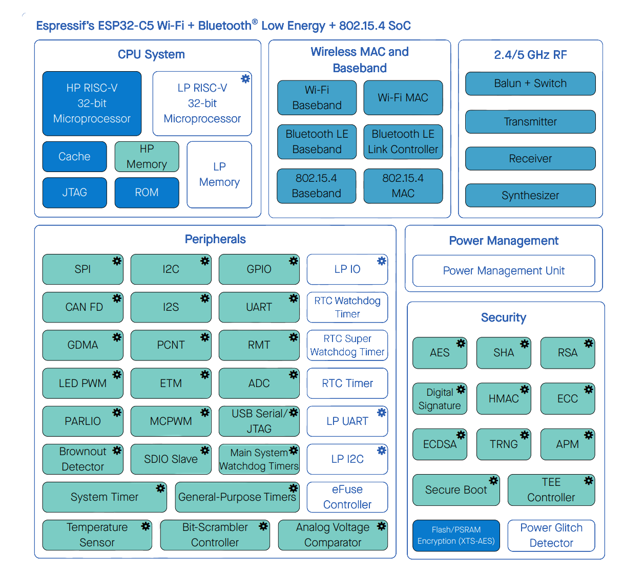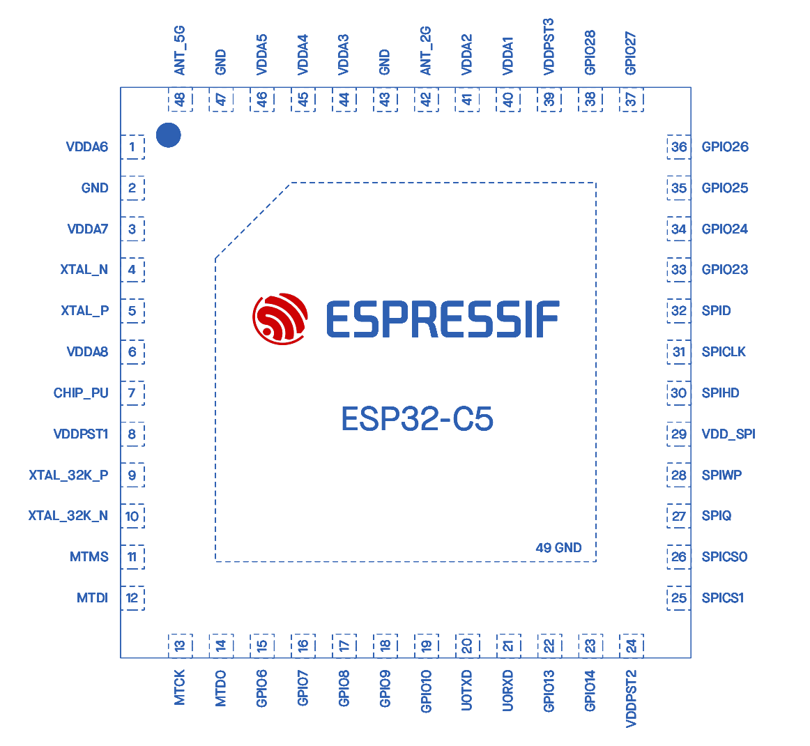 ESP32-C5系列芯片专为物联网(IoT)和智能家居应用设计。它搭载RISC-V架构的32 位单核处理器,主频高达240 MHz,配备384 KB SRAM 和 320 KB ROM,支持2.4 GHz 和 5 GHz 双频 Wi-Fi 6、Bluetooth 5(LE)以及 IEEE 802.15.4(适用于 Zigbee 和 Thread)协议,满足多种无线通信需求。