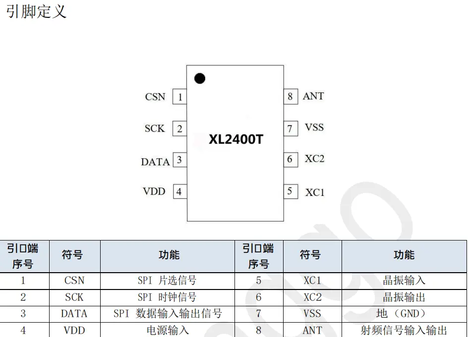 XL2400T 系列芯片是工作在 2.400~2.483GHz 世界通用 ISM 频段的单片无线收发芯片。该芯片集成射频收发机、频率收生器、晶体振荡器、调制解调器等功能模块,并且支持一对多组网和带 ACK 的通信模式。发射输出功率、工作频道以及通信数据率均可配置。芯片已将多颗外围贴片阻容感器件集成到芯片内部。容易过 FCC 等认证。