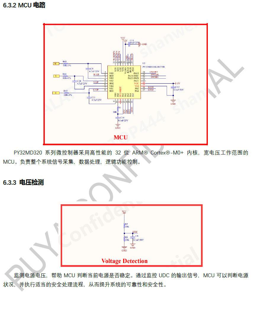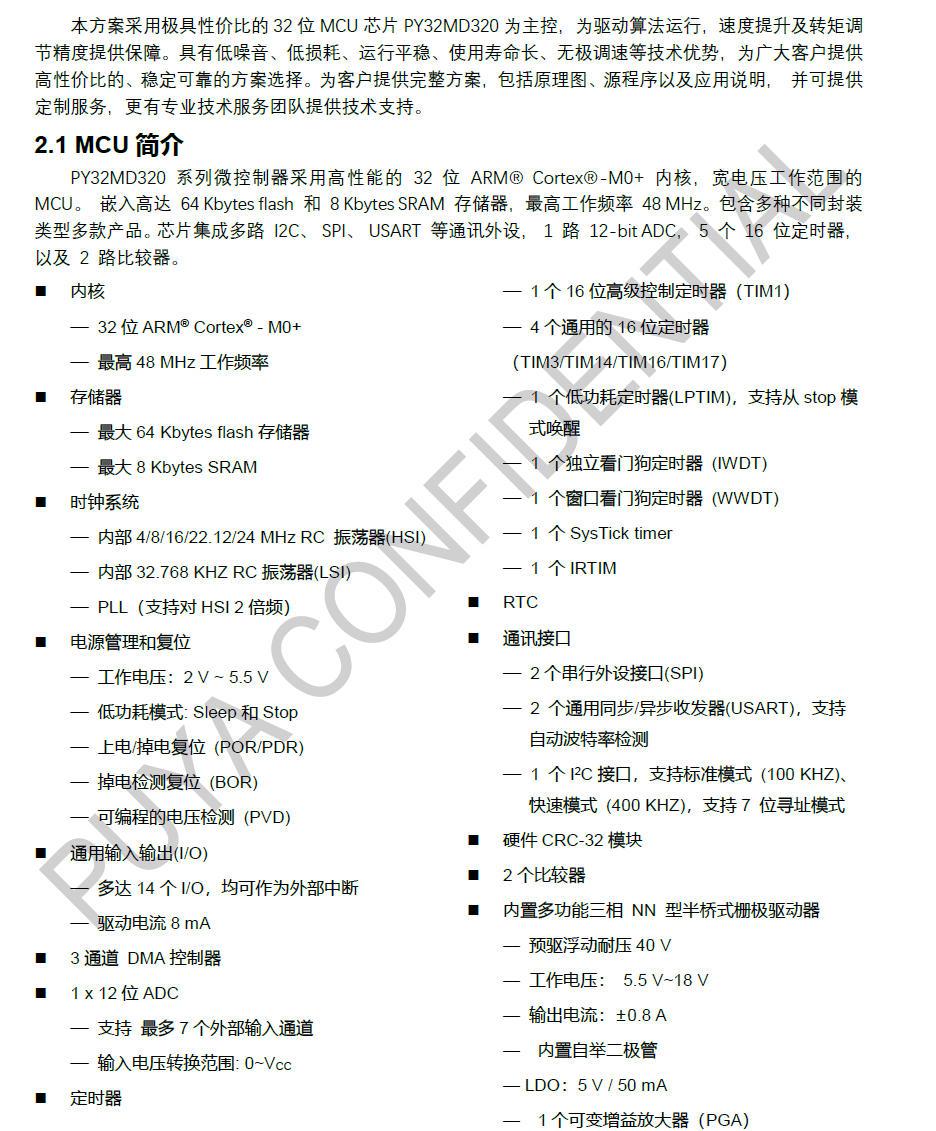 在本方案中主控芯片为合封6N 预驱的控制器,型号为 PY32MD320 ,适用于三相无刷电机的方波无感控制,核心算法通过 MCU 的 内置过零检测电路 解析出反电势过零点信号。从而实现电机方波无感控制 。